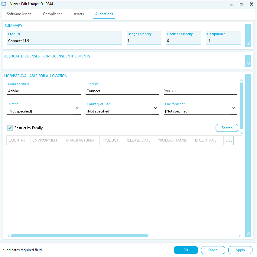 The license is allocated to usage and displays in the Allocated Licenses from License Entitlement field.- Click OK to save the change to the usage details and return to the Compliance workspace.