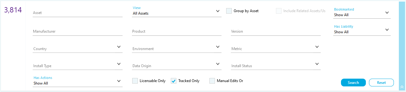 - Tick a filtering box or select options from the drop down lists. The asset count is updated: