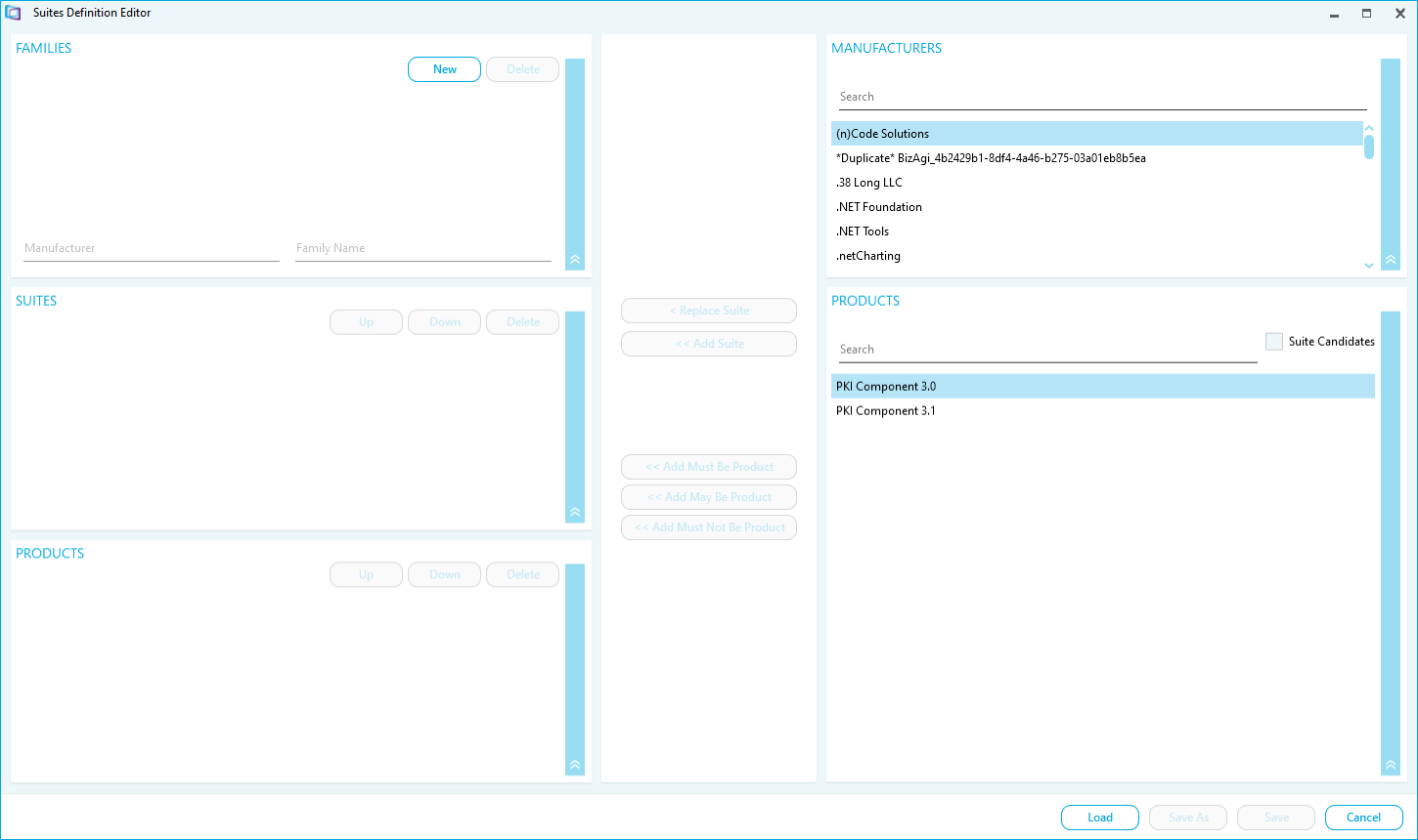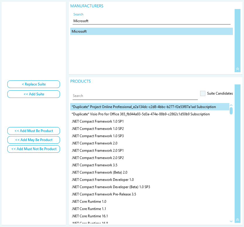 Use the Manufacturers and Products sections to search for Suites and Products to add to the lists.