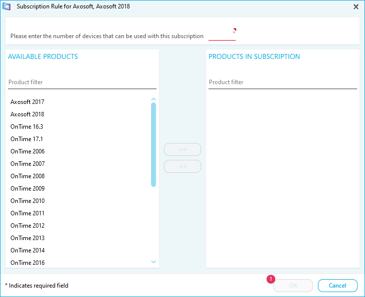 - Select an available product that are included in the subscription and click the add icon to add it to the Products in Subscription list