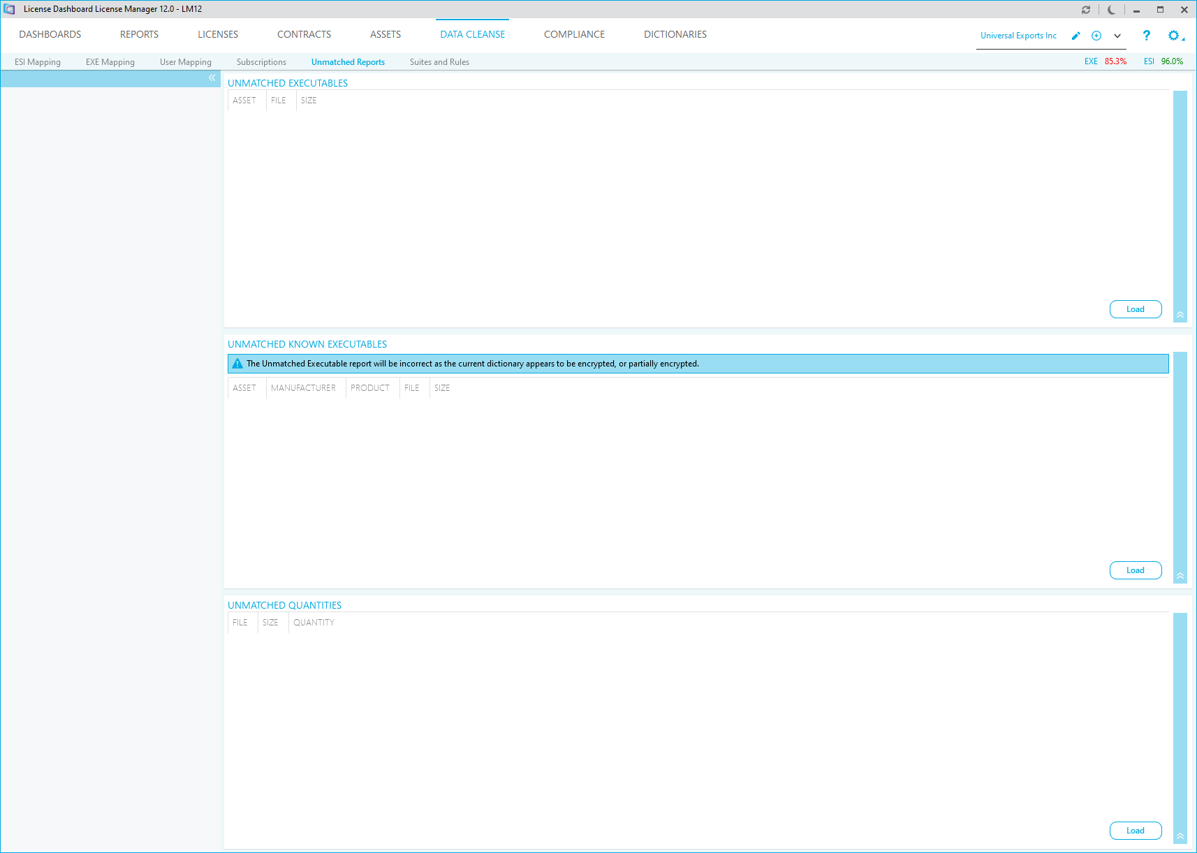 - The Unmatched Known Executables report displays unmatched .EXE files that have the same name as a primary .EXE file of a product in the dictionary. The report displays results for computers mapped to the selected business unit. Click Load to display the report. This report will not run if you are using an encrypted Dictionary.