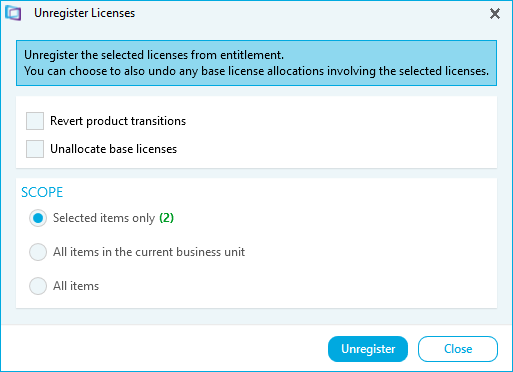 - Select All items in the current business unit to unregister licenses in the business unit you are viewing.